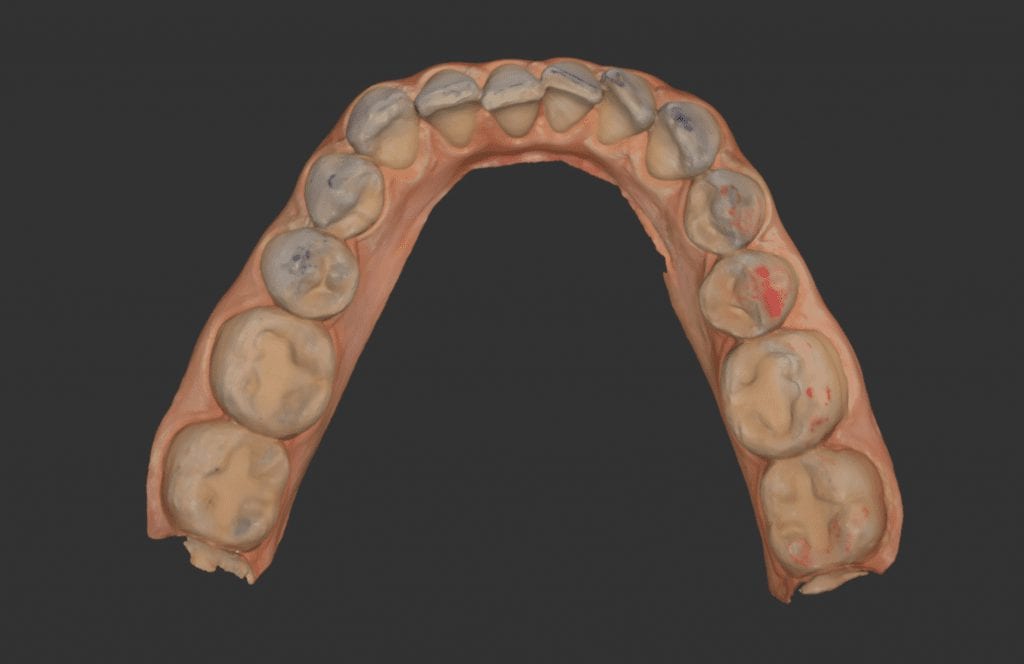 In this particular clinical case, the patient has opted to utilize clear aligners to straighten some anterior crowding. The Medit i500 was used to capture both the upper and lower jaws, and articulating paper was used to marked the clinical contact points.