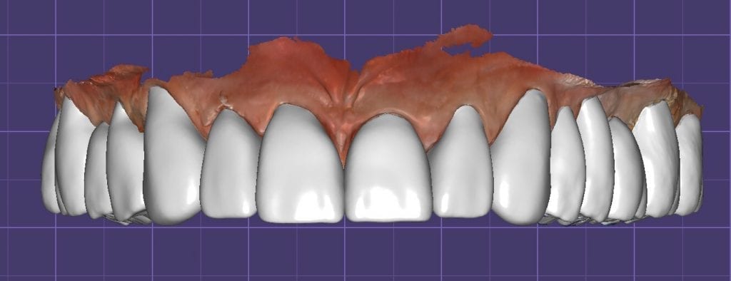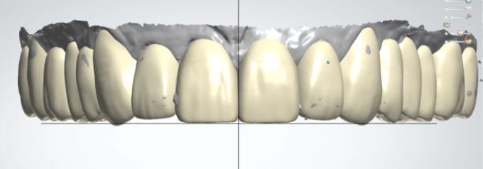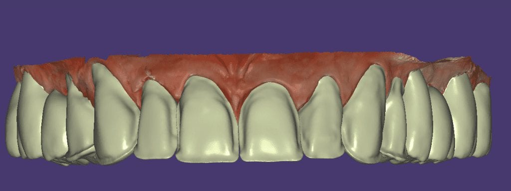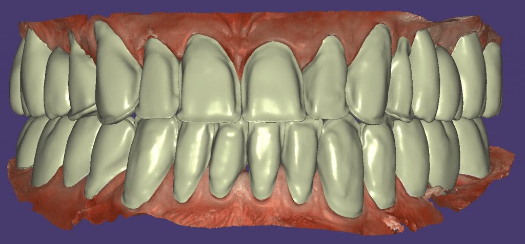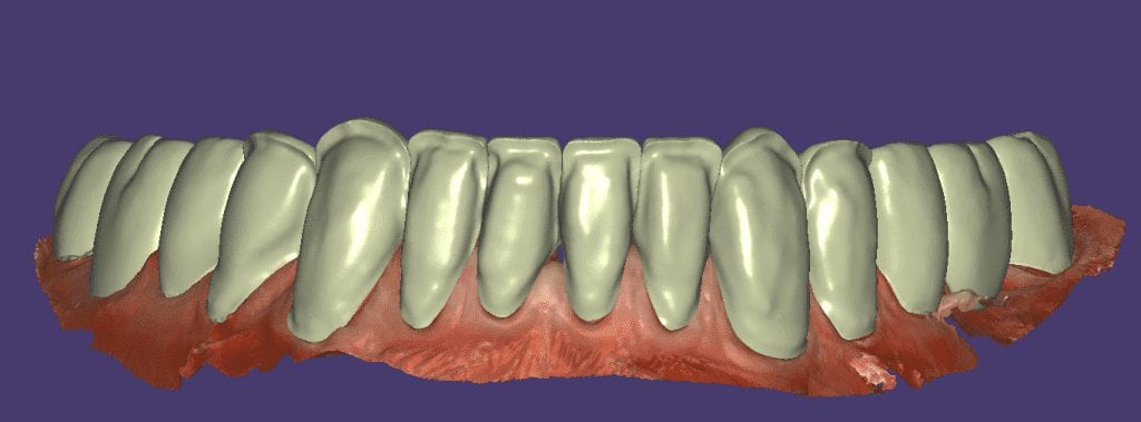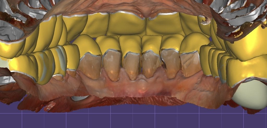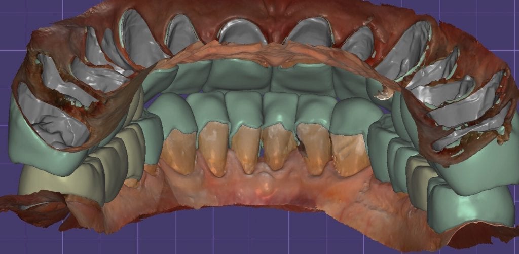 Over the course of a few appointments, the vertical dimension was reduced and the temporaries were adjusted to the patient’s desires. The new upper and lower arch were captured with the Medit i500 and the jaws were related to each other.