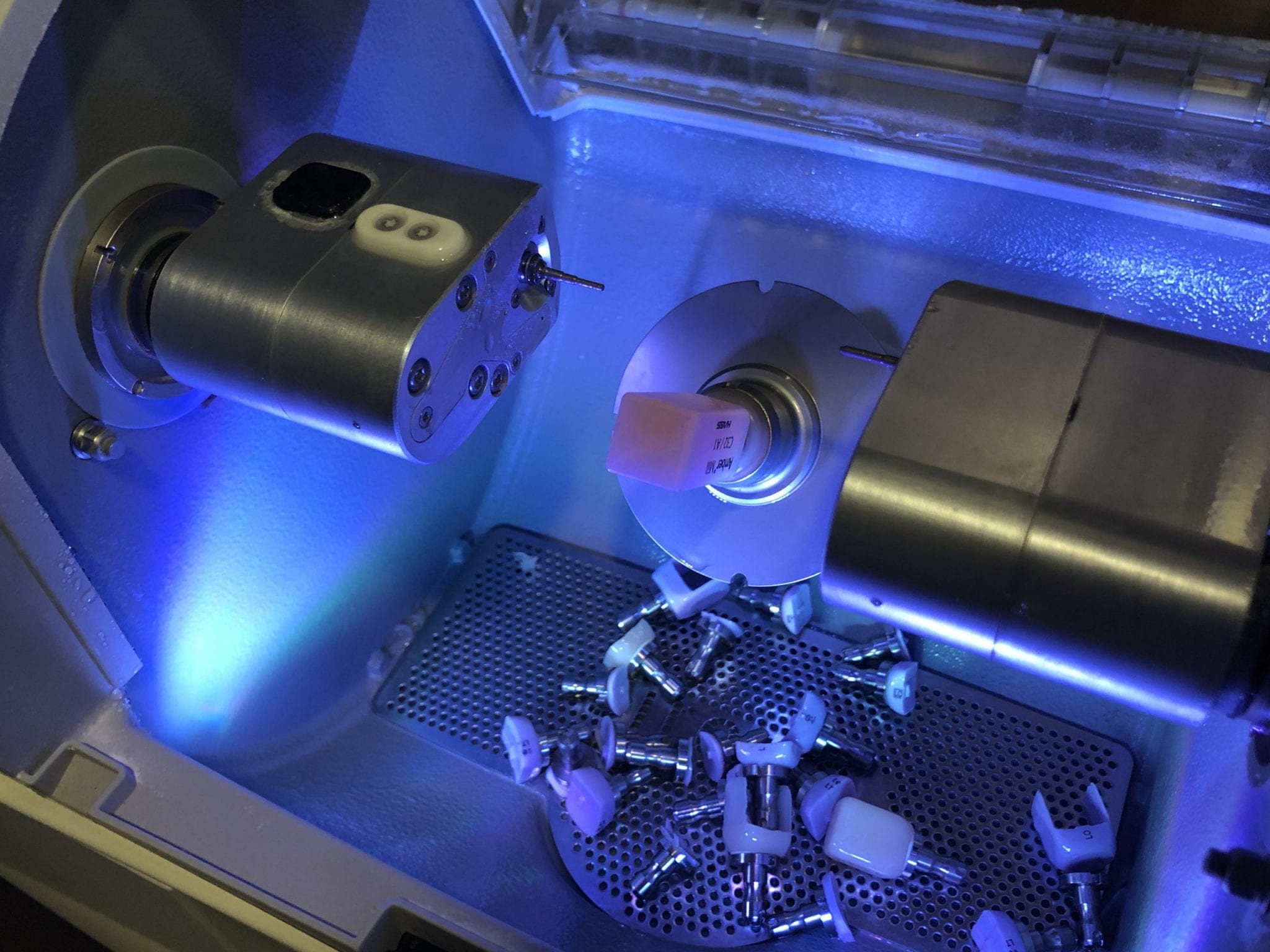 here we take an intra-oral scan with the medit i500 and design in exocad and send it to 2 different milling machines. One is the CEREC MCXL and the other is the imes icore coritec one.