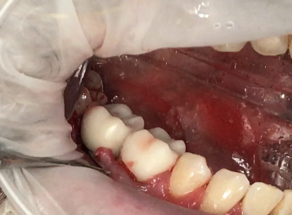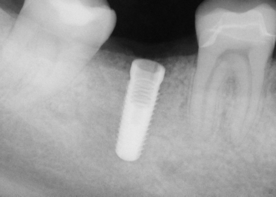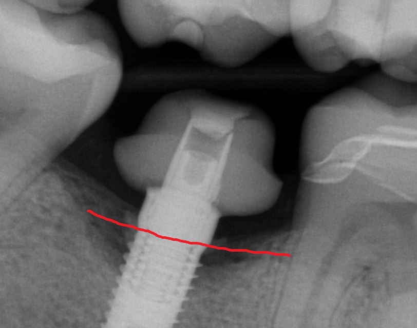 This implant was initially placed at the crest of the ridge in 2012. its placement did not allow proper emergence profile and subsequently lost bone around the head of the implant by 2015. The lack of blood flow to the crest of the bone at the cortical plate certainly could have contributed to its demise. By 2015, the bacteria trap forced a new restoration to be placed which also ultimately lead to chronic inflammation due to improper contours. The implant itself was well integrated and the decision was made to remove the top 3-5 mm of the implant and treat it as a cast post and core.