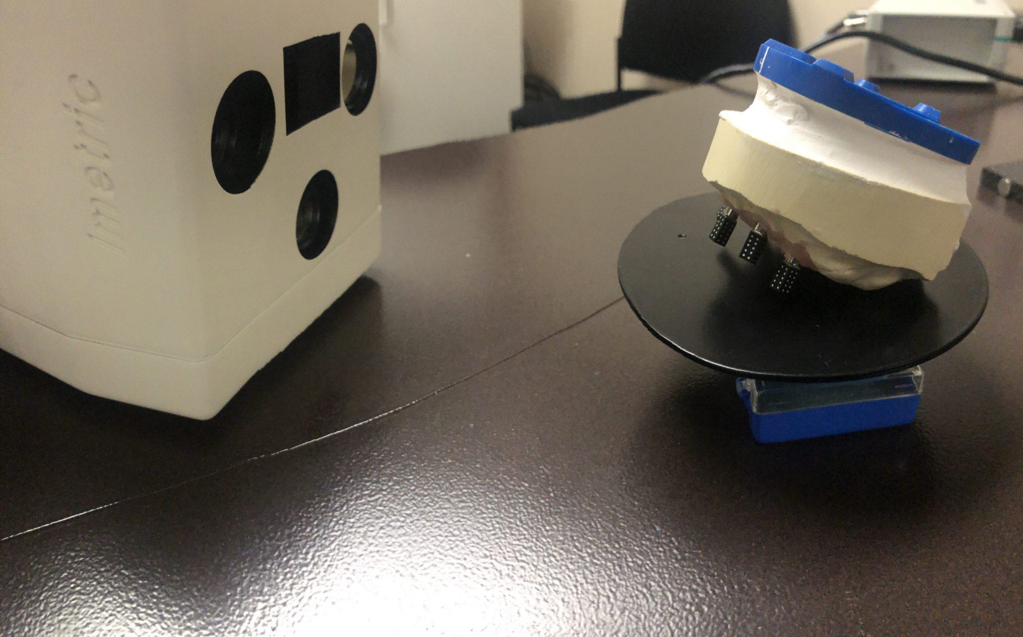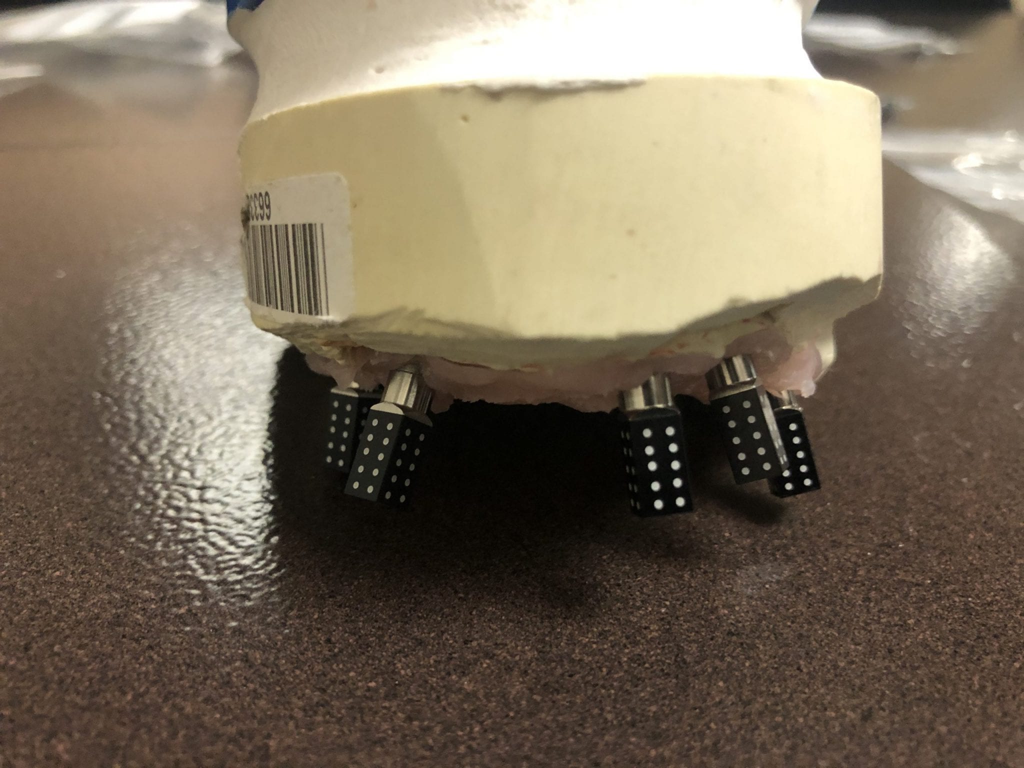 After the camera is calibrated, the patient, or in this demonstration case, the model with Multi-Unit Abutment analogs is mounted with ICam Reference Bodies that are shaped like dominos. They can attach to the multiunit abutment or directly to the implant fixture (available soon in the USA).